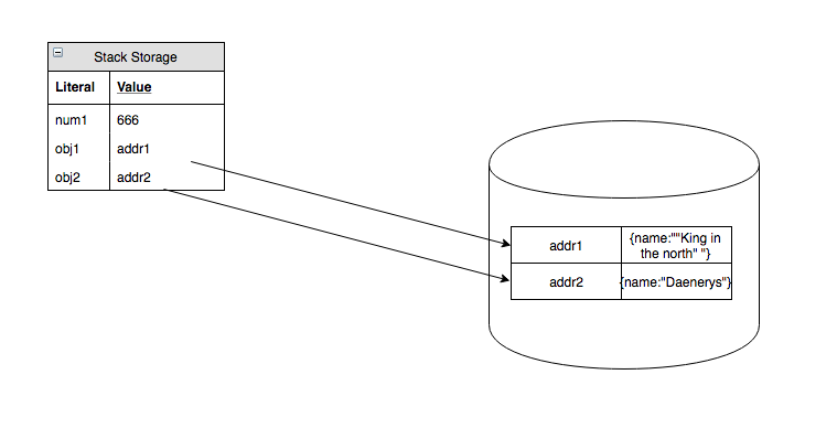 num1,obj1, obj2被声明并存在相应的stack内存,因为num1是basic value,直接按照值存,obj1,obj2分别开辟了heap的两块内存并且地址设为addr1,addr2。我们假设obj